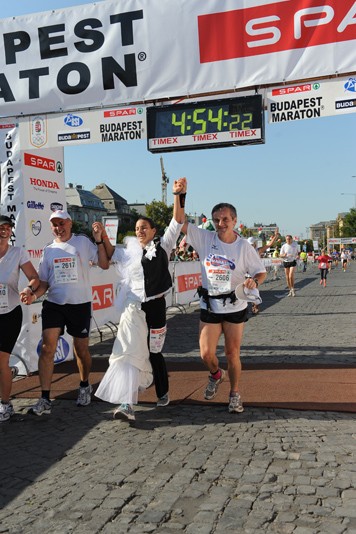 Na, és a futás. Majdnem féltávig örömfutás, aztán bejelzett a rendszer, hogy sürgősen kis kék helységet kéne keresni, ami eléggé meglepett, mert nem szokott futás közben ilyen gondom lenni. Az első talált példány igencsak "lelakott" volt, így továbbálltam, keserves kilométerek következtek amíg találtam egy másikat. Sajnos Sneci-kével és Pocokharcsával pont itt akadtam össze, sajnálom, hogy nem a legvidámabb oldalamat tudtam mutatni :-/ A kissé ugyan felforrósodott és igencsak szűk kék dobozka látogatása után viszont felszabadultabban tudtam haladni, csak épp az útvonal talán leguncsibb része következett ....amit néhány Futóbolondnak azért sikerült feldobnia a jelenlétével :) A dél-budai kitérő után a rakpartra visszatérve viszont elegem lett. Miből? Nem is tudom. Egyszerűen semmi kedvem nem volt még tizensok kilométert javarészt a rakparti napon megtenni, ráadásul visszacsúsztam eléggé a mezőnyben, még nem zombieföldre, de a már kevésbé motiváló szakaszba, az ismerősök vagy jóval előttem vagy kissé lemaradva....Nevezhetjük holtpontnak is, végülis az is volt, kellett valami vagy valaki aki továbblendít. Elvergődtem a pesti oldalra és hagytam, hogy előzzenek a futók, hátha jön Berzsó vagy Lbtibsz vagy Pocokharcsa és ráfoghatom a lazázást a közös futásra. Kívánságom teljesült, jött Tibor (lbtibsz) és bár nem volt túl kommunikatív, elkocorásztunk együtt egészen a célig. A kedvem fokozatosan jött vissza, kezdtem újra élvezni a futást, Monique-nak is őszintén örültem, mikor megpillantottam, próbáltam buzdítani a lassulókat, sétálókat, még az utálatos Dráva utcai fordító is hamarabb jött el, onnan meg már csak be kell csorogni :) Szerencsémre, szótlan Tiborom mellé akadt egy rövid szakaszra egy beszédesebb Tibor, majd a felüljárón csatlakozott Tibor tájfutó barátja, Imre, aki szurkolni jött ugyan, de futott velünk egy kicsit. A célegyenesben még megpendítem, hogy befutózhatnánk a Suhanj csapattal, de elhúznak, én meg már bunkóságnak érezném ha nem maradnék Tiborral végig. Az utolsó száz méterre összeáll a kis csapat, Tibor futótársaival kiegészülve, négyen kézenfogva lépjük át a célvonalat. Kocsis Árpi vár az éremmel, Tiborhoz irányítom, megérdemli, hatalmas PB-t futott, most először 5órán belül!